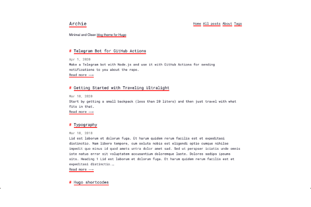 Archie is a minimal and clean theme for hugo with a markdown-ish UI.