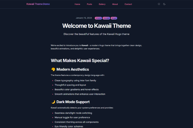 A modern and cool Hugo theme with beautiful kawaii aesthetics, dark mode support, and delightful animations