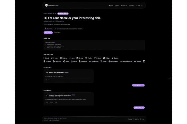 A minimal, dark-mode first Hugo theme with true black backgrounds, purple accents, and comprehensive content styling. Features responsive design, search, TOC, and multiple page layouts.