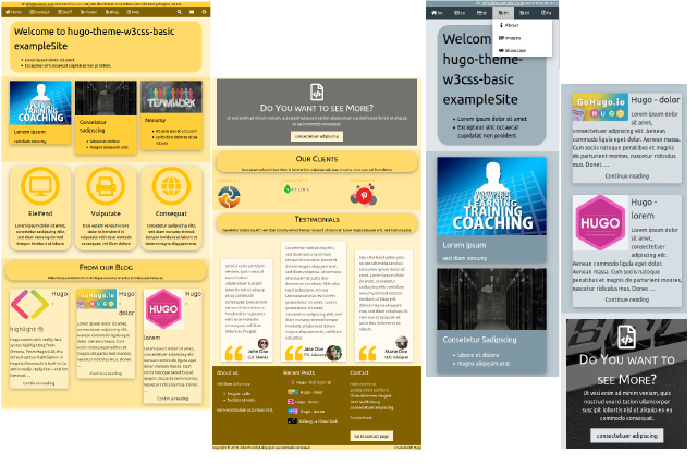 This theme is built with W3.CSS and is highly configurable. More than 100 monochromatic color themes and 25 shortcodes. It has support for Cookie consent, image processing, image galleries, page bundles and resources (attachments).