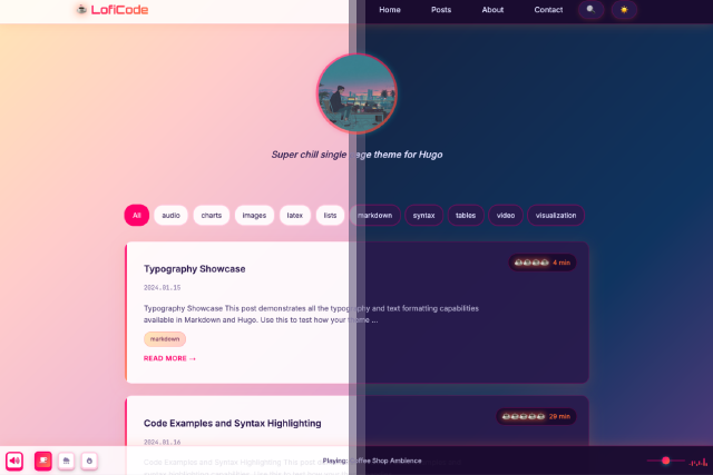 A cozy, lo-fi inspired Hugo theme. Features ambient sounds, dark/light themes, and a retro aesthetic with modern functionality.