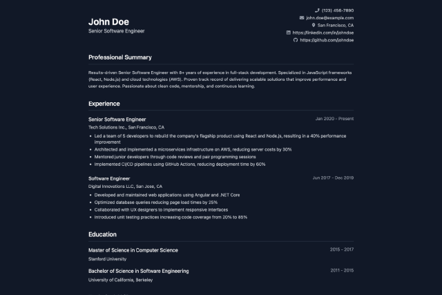 NightFolio is a lightweight Hugo theme designed for showcasing professional resumes and portfolios. It uses Tailwind CSS for styling and contains fully modular sections out of the box.