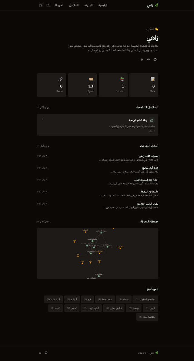 A modern Arabic RTL Hugo theme designed as a digital garden with Obsidian-like features including wiki-links, knowledge graph, backlinks, and series support.